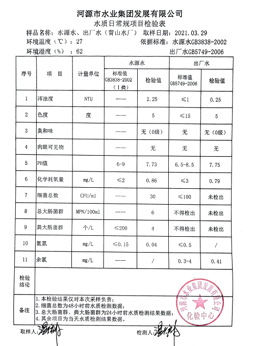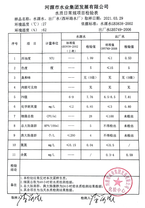2021年3月29日水質(zhì)檢驗報告