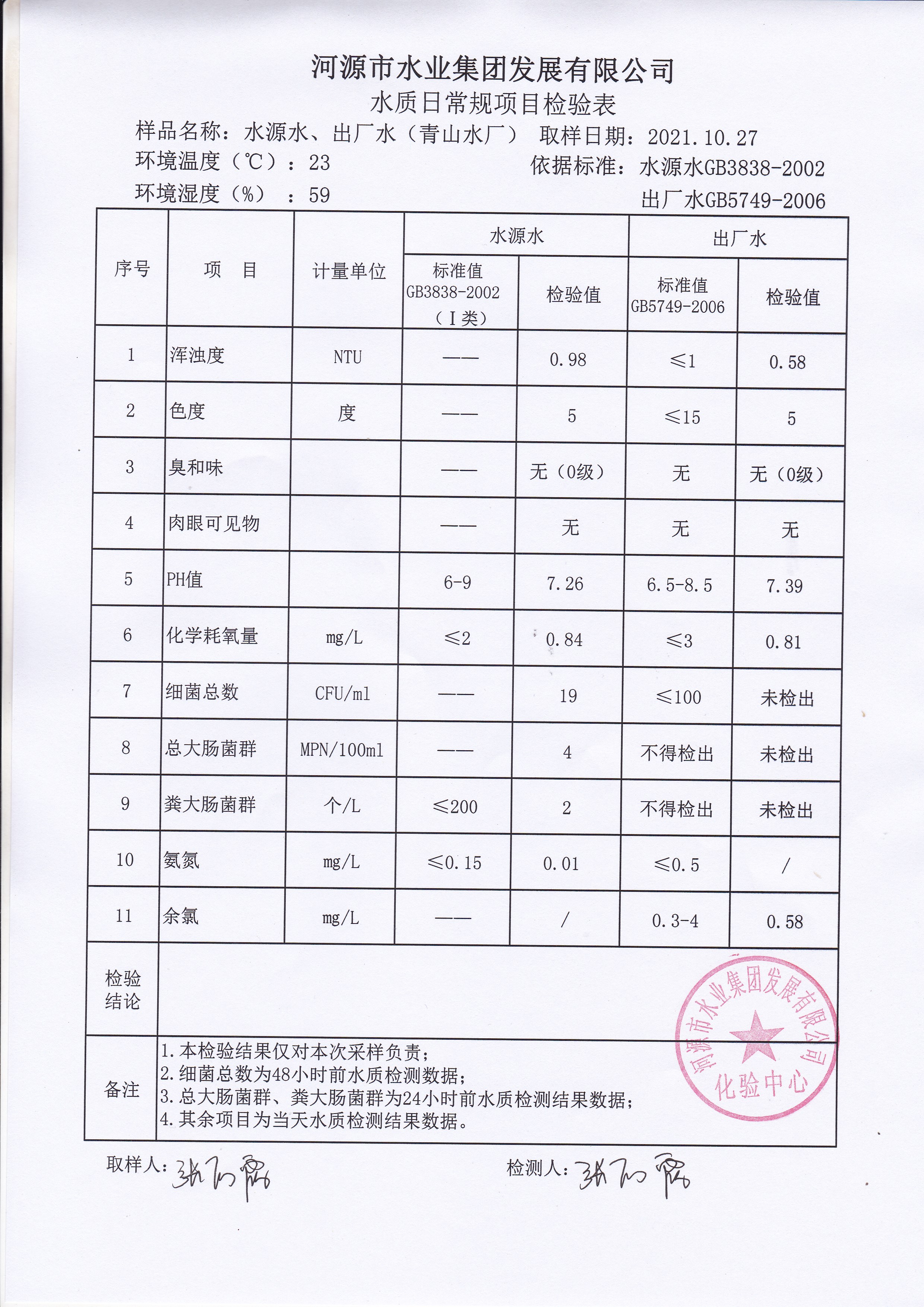 2021年10月27日水質(zhì)檢驗(yàn)報(bào)告