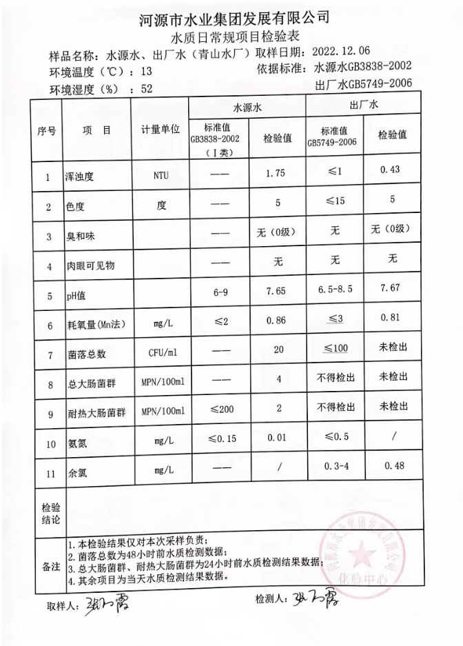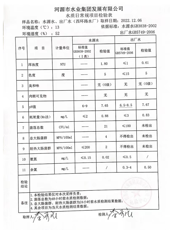 2022年12月6日水質(zhì)檢驗(yàn)報告