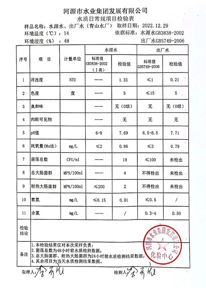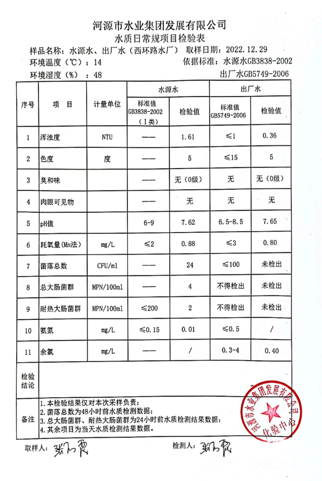 2022年12月29日水質(zhì)檢驗報告