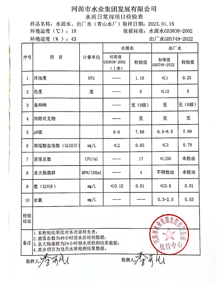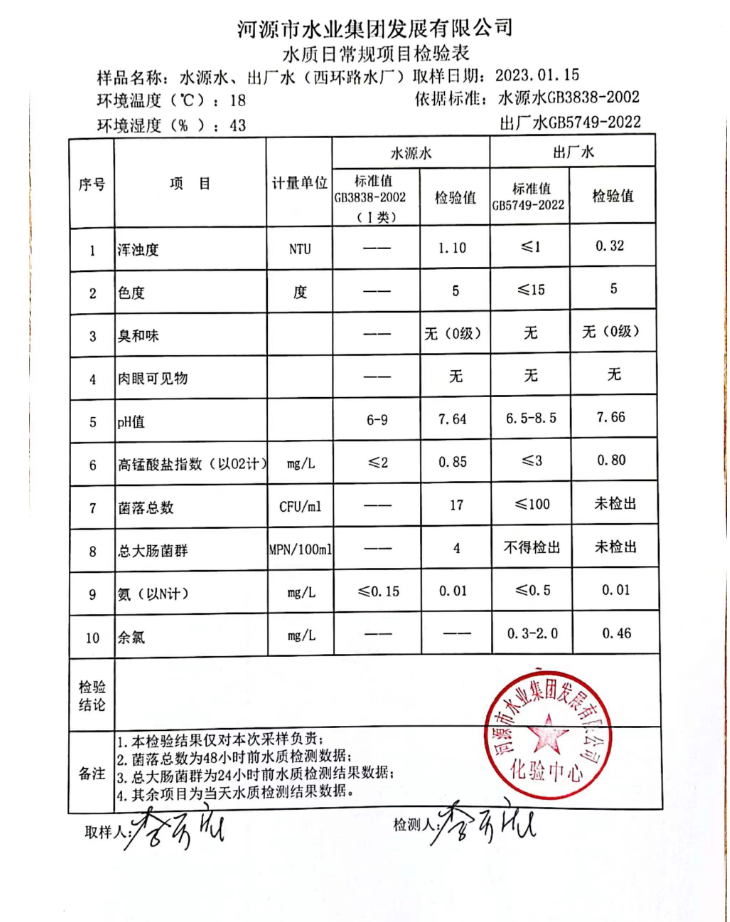 2023年1月15日水質(zhì)檢驗(yàn)報(bào)告
