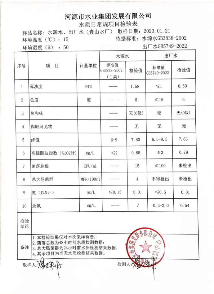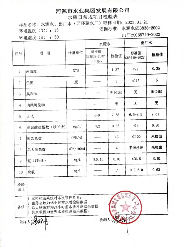 2023年1月21日水質(zhì)檢驗(yàn)報告