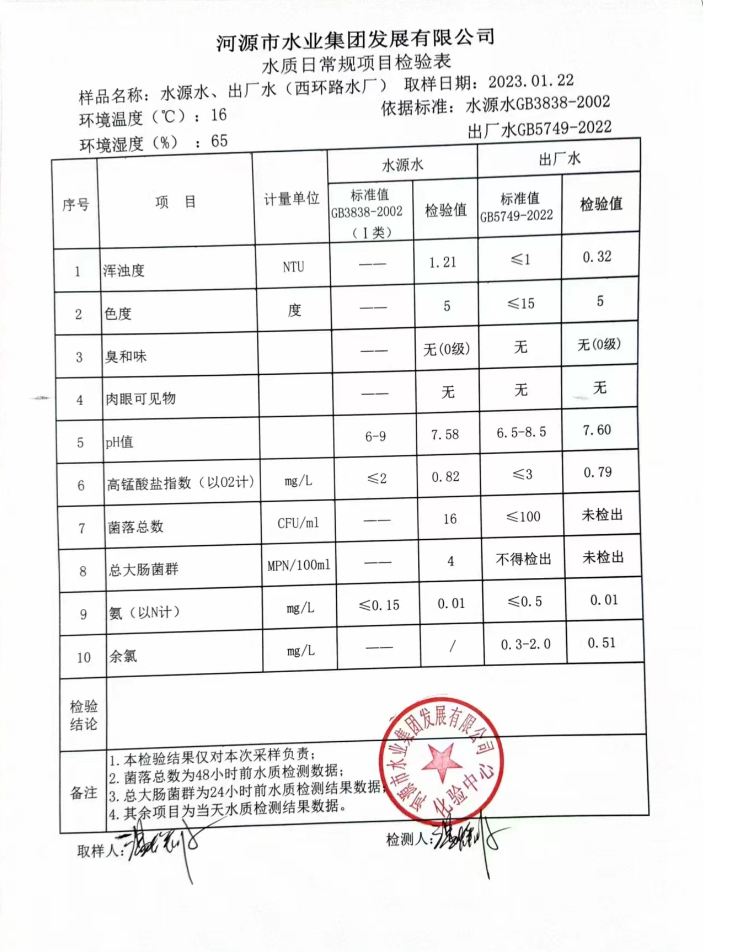 2023年1月22日水質(zhì)檢驗(yàn)報(bào)告