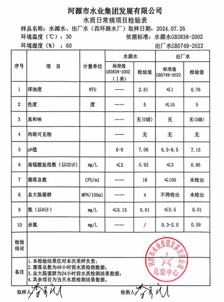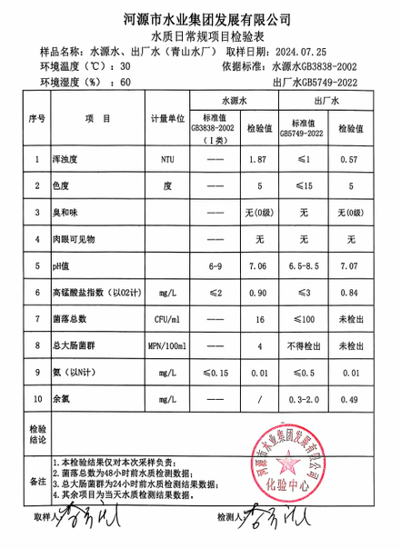 2024年7月25日水質(zhì)檢驗(yàn)報(bào)告